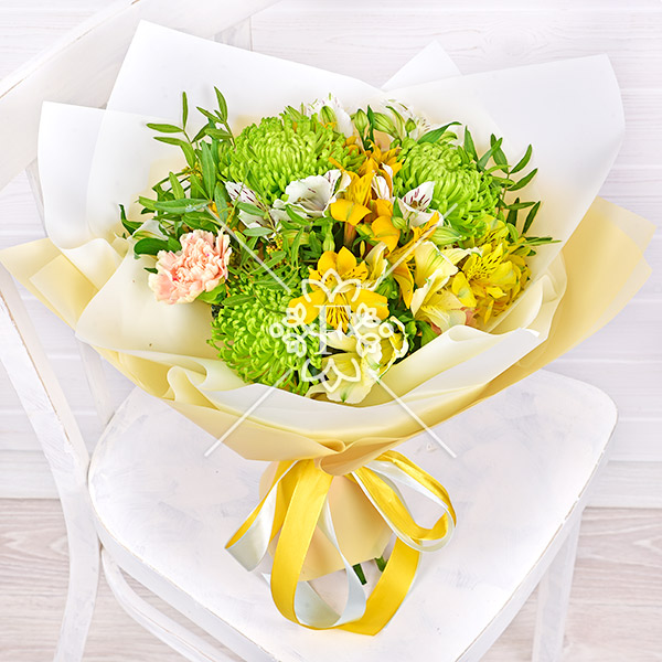 хризантема зеленая одноголовая – 1 шт., альстромерия желтая – 3 шт., альстромерия белая – 1 шт., гвоздика персиковая – 2 шт., зелень декоративная (фисташка), упаковка, лента.